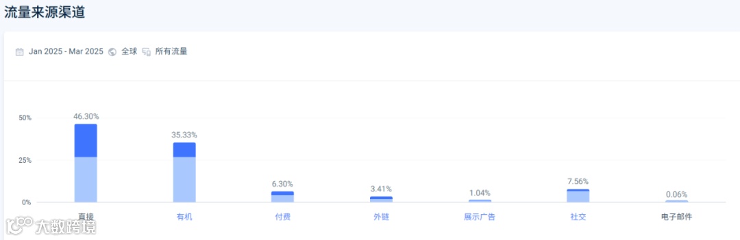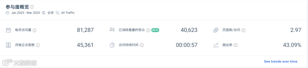 图源:Similarweb跳出率为43.09%,低于行业平均水平,页面数/访问为2.97,表明用户浏览深度较好。总访问量增长了36.92%,整体增长势头强劲,需持续更新内容并拓展市场。
