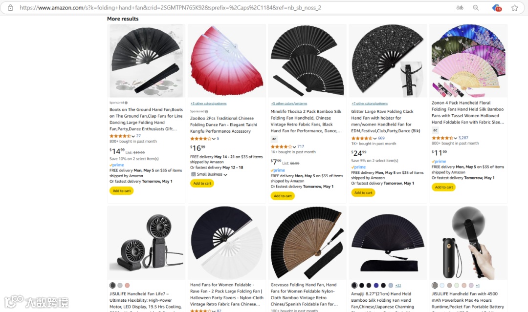 亚马逊上搜索“folding hand fan(折叠扇)”,单品售价在7-14美元,包括传统手工扇、现代折叠扇、装饰扇灯,满足不同消费者的需求。其中一款丝绸折扇,近30天销量超4000件,位列类目销量榜TOP。
