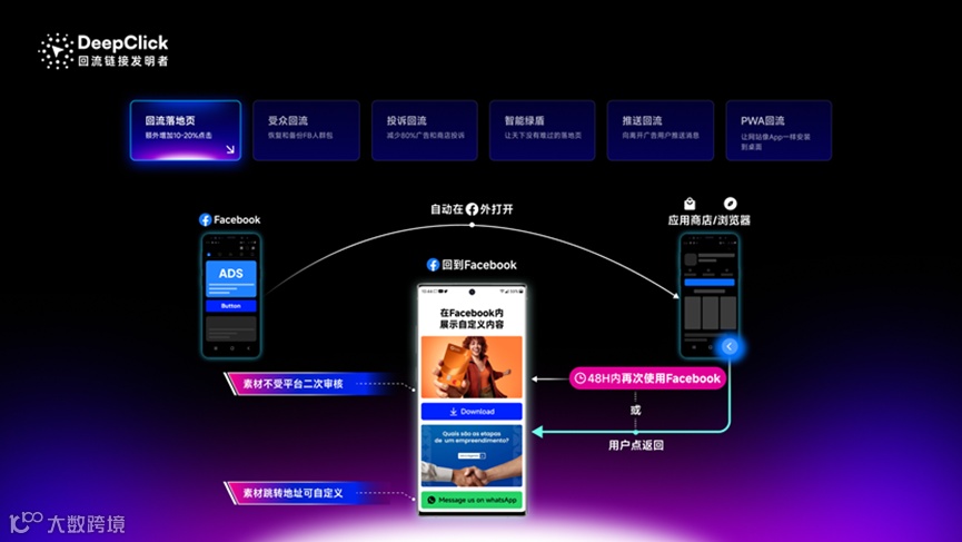 你是否经历过,在 Facebook 等社交平台看到广告点击后,却因页面体验不佳或加载缓慢而瞬间离开?Deepclick的回流素材页解决方案,能在访客从你的独立站跳转回 Facebook 等平台时,自动弹出一个完全自定义的专属页面。该页面内容不受媒体平台审核限制,可设计为强诱惑力的优惠券领取页、新品预告或客户案例展示,在关键时刻再次挽留客户,化流失为转化。