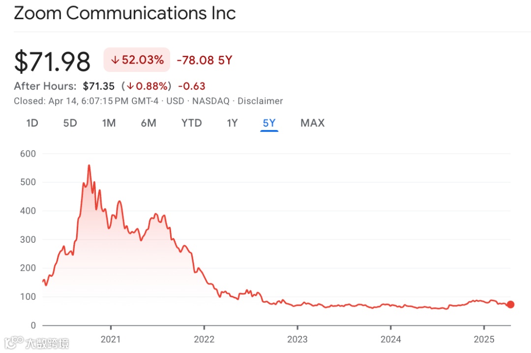 然而,随着疫情的结束,多数工作也回到日常的线下状态,ZOOM的市值出现了持续回落,累积跌幅高达460%,目前连30亿美元都不到。
