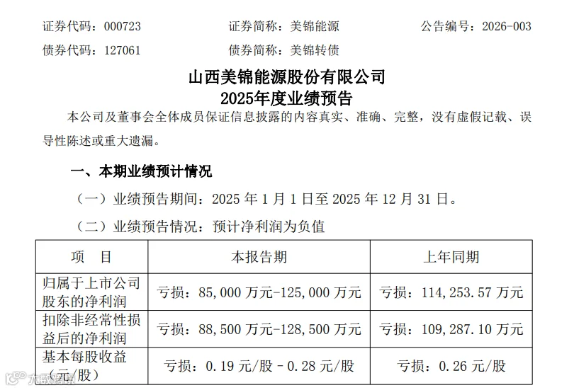获悉,1月16日,山西美锦能源股份有限公司(简称:美锦能源)发布2025年度业绩预告。