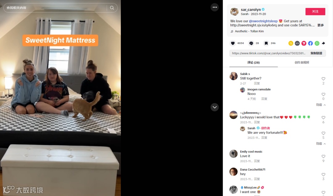 而在TikTok,SweetNight采用相似策略构建推广矩阵,但将注意力更多专注头部博主。sar_carolyn是一个拥有百万粉丝的家庭频道,发布床垫合作视频后获得了超4000次播放,进一步扩大了品牌影响力。