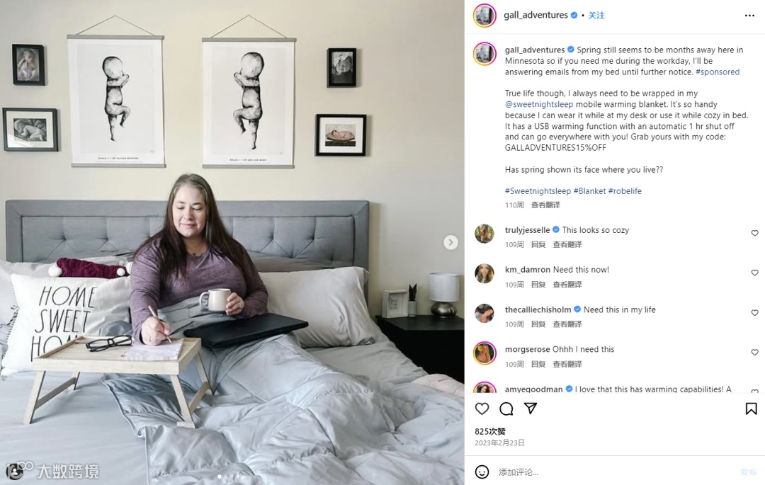 在Ins,SweetNight聚焦小型家居红人合作发布赞助内容。例如拥有3.3万粉丝的红人“gall_adventures”,在2023年发布的保暖毯推广内容获得了800+点赞,评论出现众多寻求购买链接的网友。