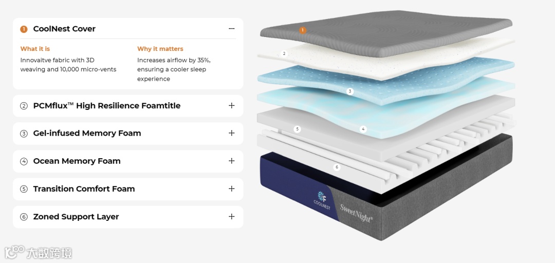 例如,售价359.99美元的凉感床垫,采用六层功能泡沫床垫设计,结合新一代冷却材料结合记忆泡沫,不仅将温度降低8度,同时确保高质舒适度。高品质材料融合极致的工学设计,为SweetNight床垫塑造了一个质量优异的品牌形象。