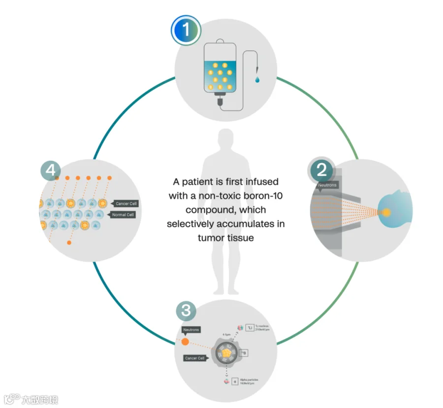 中子触发核反应:患者暴露于特定中子源下,低能量中子穿透人体并被10B俘获, 10B原子核裂变产生具有高细胞杀伤能力的a射线粒子和反冲核锂-7粒子, 粒子射程仅几微米(约在一个细胞直径内) ,因此可不损伤周围正常组织情况下,精确地杀死肿瘤细胞。