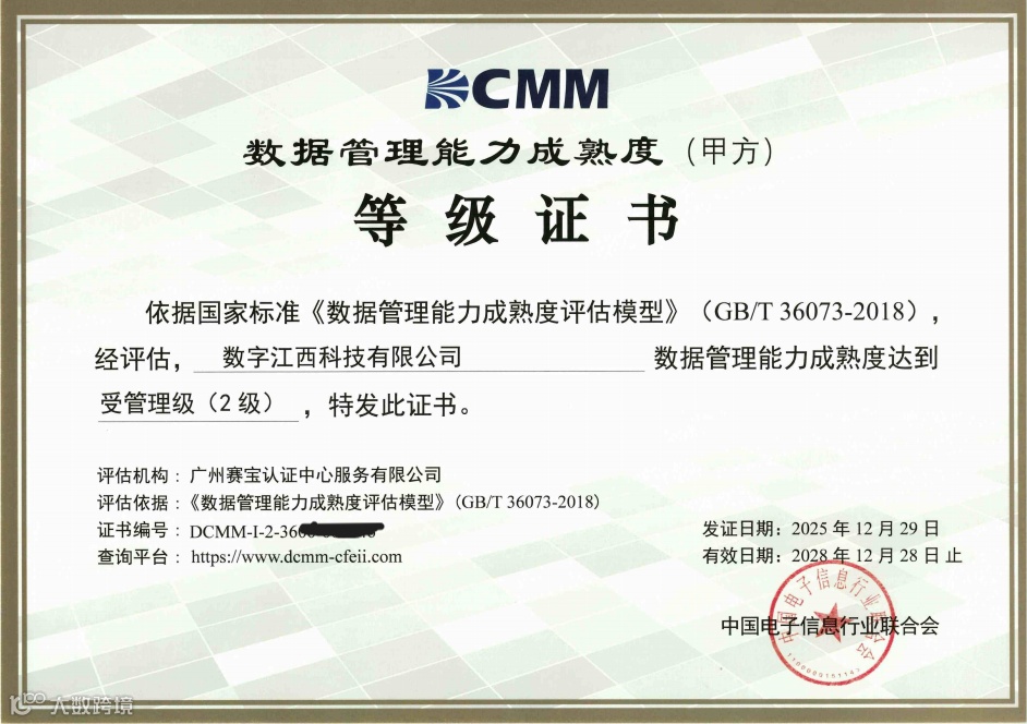 近日,江西数字集团所属企业数字江西成功通过国家标准《数据管理能力成熟度评估模型》(GB/T 36073-2018)评估,同时斩获数据管理能力成熟度(甲方)、(乙方)双受管理级(2 级)等级证书。