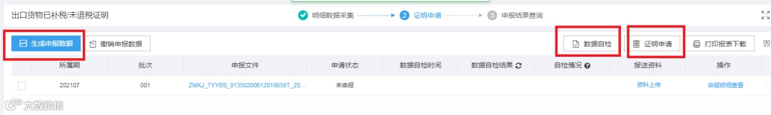 点击【生成申报数据】,数据自检无误后,勾选并点击【证明申请】完成正式申报。
