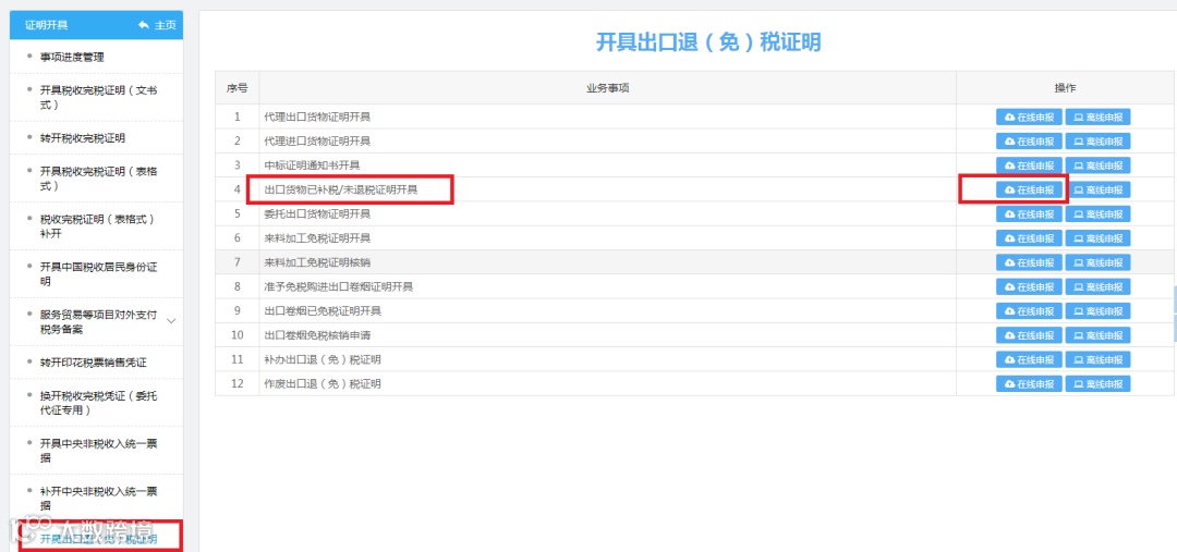 进入【我要办税】→【证明开具】→【开具出口退(免)税证明】→【出口货物已补税/未退税证明开具】,选择在线申报。