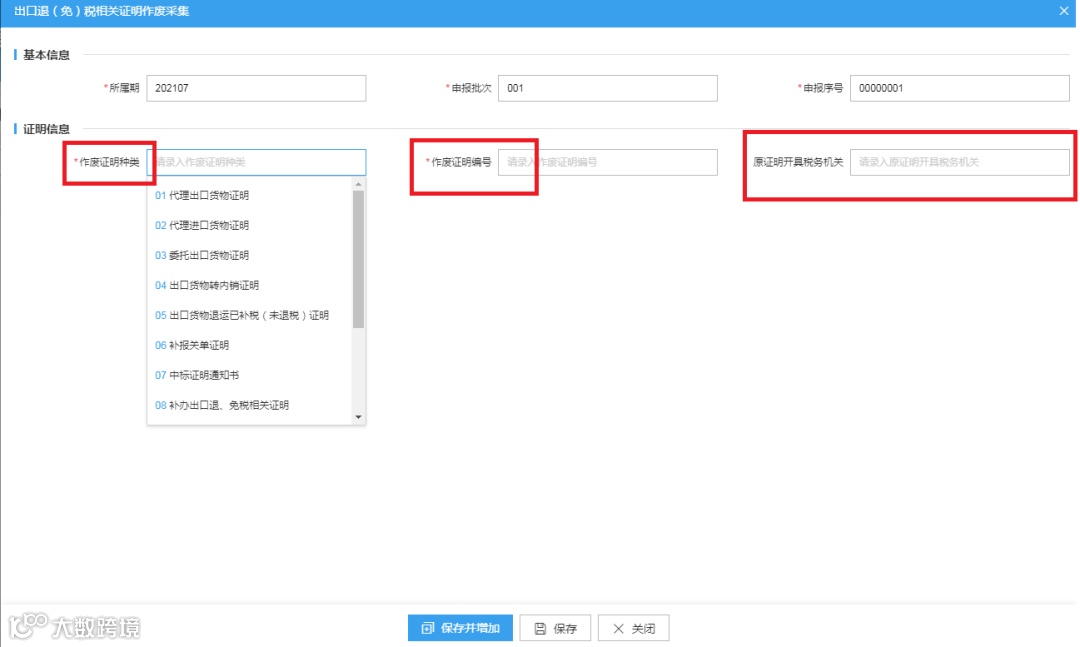 在明细数据采集中点击“新增”,填写需作废的“作废证明种类”、“编号”和“原开具税务机关”并保存。