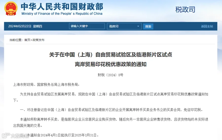 一、对注册登记在中国(上海)自由贸易试验区及临港新片区的企业,在开展离岸转手买卖业务中书立的买卖合同,予以免征印花税。本政策自2024年4月1日起施行至2025年3月31日。