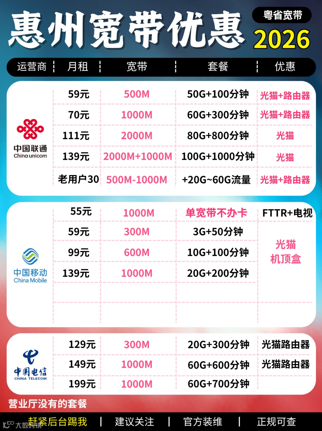 这些全是惠州 2026 能办的 “营业厅私藏款”,比公开套餐划算不止一点。要不要我帮你整理一份按区域分类的套餐挑选清单?