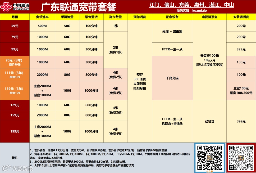 月租 129,宽带 1000M,流量 60G,但通话涨到 600 分钟,能办 4 张副卡(2 张免费)。设备和机顶盒没有默认配置(得和当地联通确认),安装费也没标注 —— 建议办之前问清楚细节,适合经常打电话的家庭。