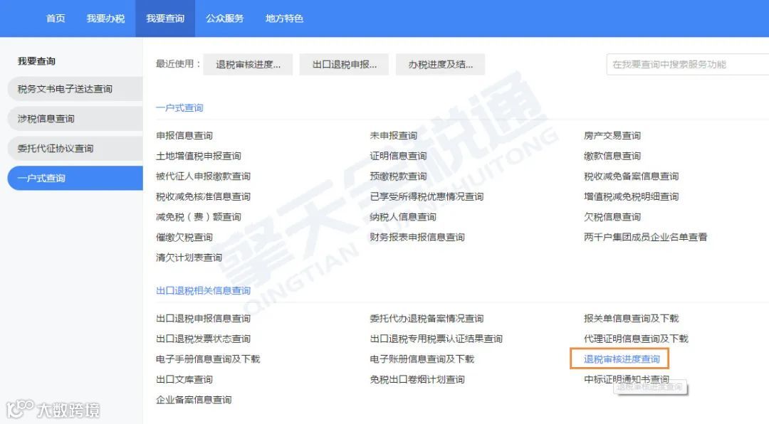 - 途径一:“我要查询”—“一户式查询”—“出口退税相关信息查询”—“退税审核进度查询”;