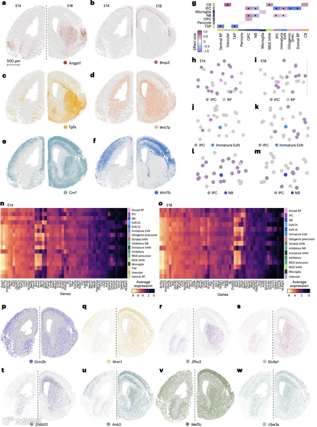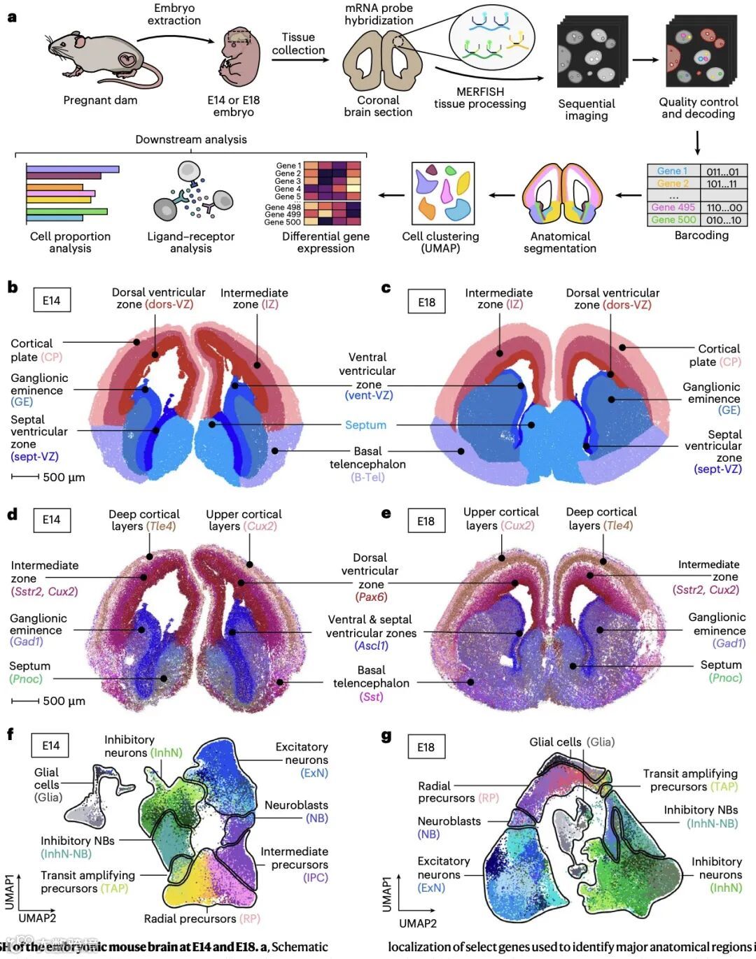 研究团队采用多重抗错荧光原位杂交(MERFISH)技术,对 E14 和 E18 两个关键发育阶段的小鼠胚胎大脑进行分析,聚焦 500 个免疫相关基因的表达模式。结果显示,胚胎大脑的神经免疫景观随发育动态变化:从 E14 到 E18,神经前体细胞比例下降,胶质生成前体细胞及成熟神经元增多,小胶质细胞相关基因模块呈现高度动态性,而内侧神经节隆起(MGE)中间神经元相关基因模块则保持稳定。