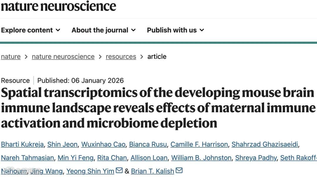 近日,一项发表于《自然・神经科学》(Nature Neuroscience)的研究通过空间转录组学技术,绘制出孕中后期小鼠胚胎大脑的高分辨率神经免疫景观图谱,揭示了母体免疫激活(MIA)和微生物组耗竭(MMD)对胎儿脑发育的深远影响,且发现其作用存在显著性别特异性。该研究为理解神经发育障碍(NDDs)的发病机制提供了全新视角。