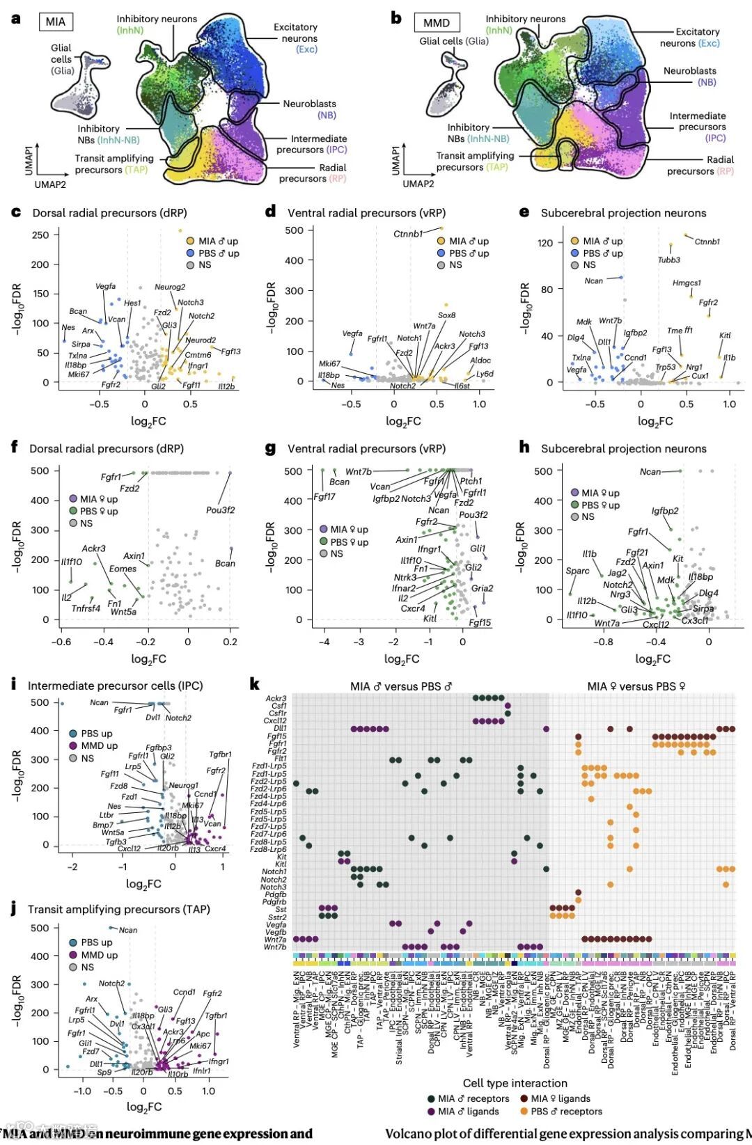 更关键的是,研究发现 CXCL12/CXCR7 趋化因子网络是 MIA 和 MMD 影响神经发育的共同关键通路。MIA 会导致雄性胚胎多种细胞中 Ackr3(编码 CXCR7)表达升高,而 MMD 则使雌雄胚胎的 Ackr3 表达均上调,但雄性纹状体抑制性神经元中表达更高。体外实验证实,雄性神经前体细胞对 CXCL12 更敏感,暴露后更易分化为成熟神经元,这与雄性胚胎 Ackr3 基因非编码区染色质可及性更高的表观遗传特征一致。