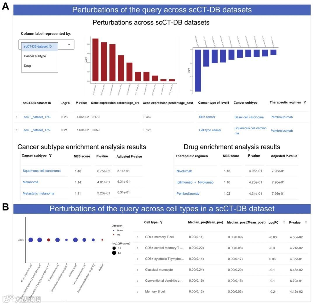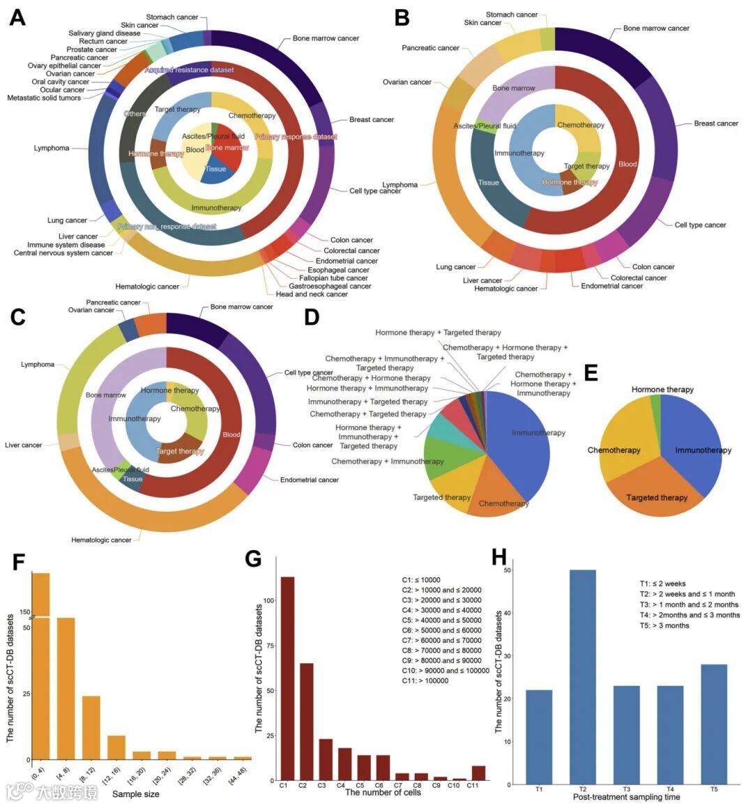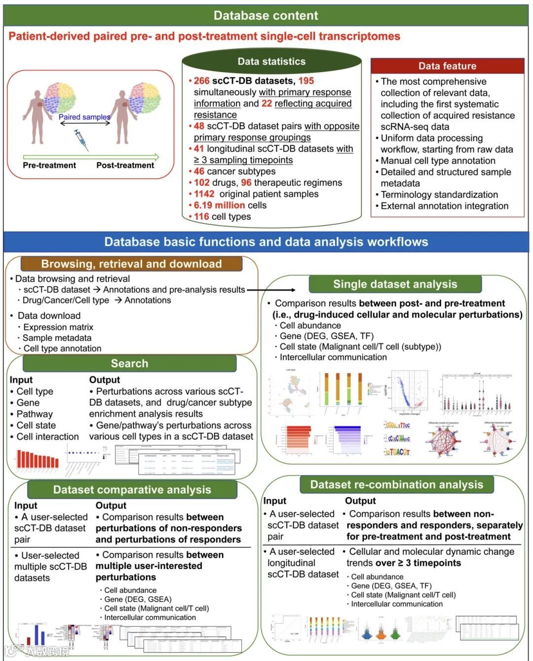 该数据库收录了 266 个治疗前后配对的单细胞转录组数据集,涵盖 619 万个细胞、1142 份原始患者样本,覆盖 27 种主要癌症类型、96 种治疗方案和 102 种药物,包括化疗、免疫治疗、激素治疗和靶向治疗等多种治疗方式;