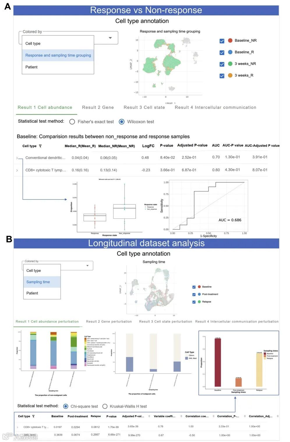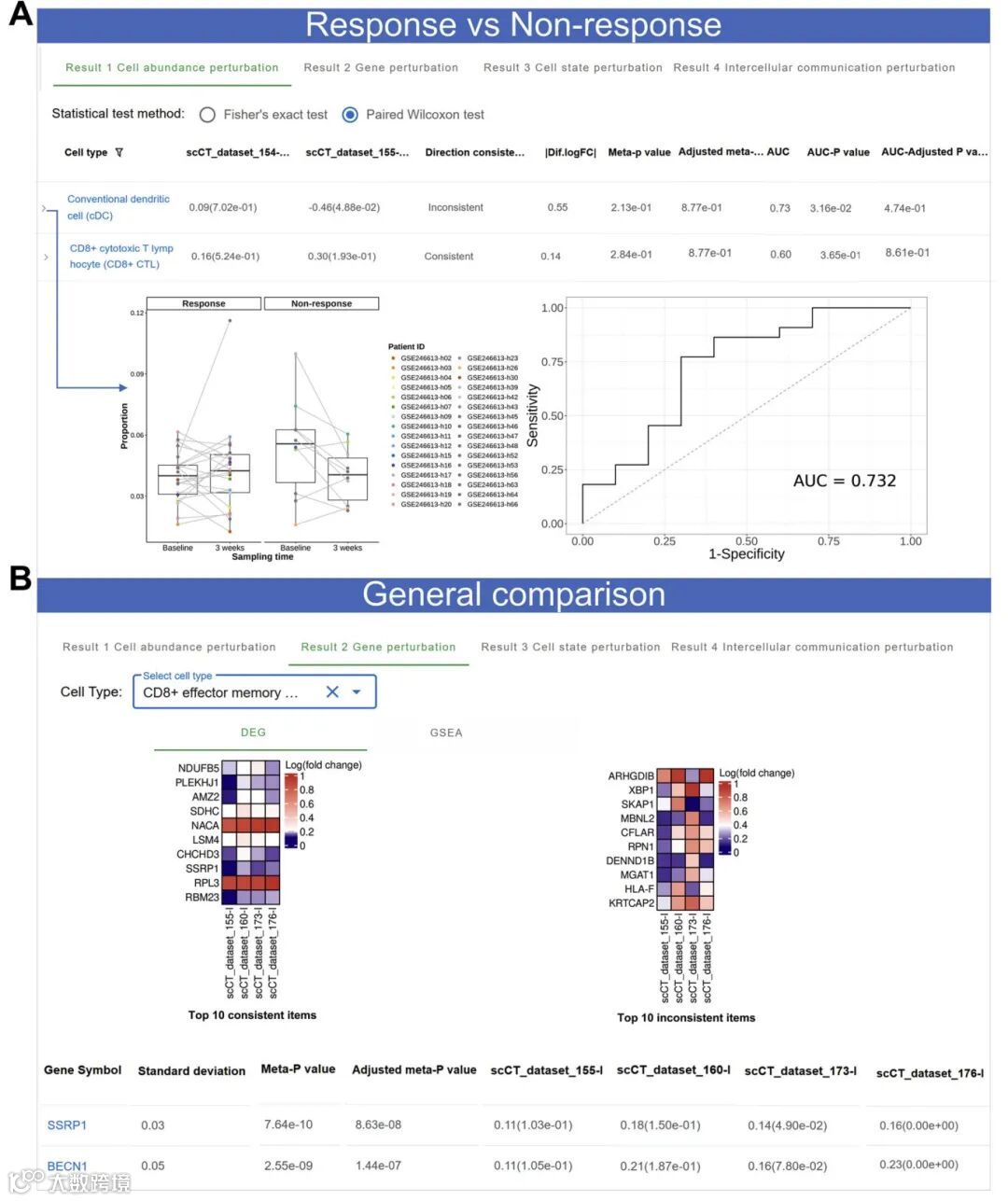 在功能设计上,scCT-DB 具备强大的数据分析能力。用户可通过浏览、检索模块快速获取感兴趣的数据集,下载基因表达矩阵、样本 metadata 等核心数据。数据库内置的单数据集分析功能,能从细胞丰度、基因表达、细胞状态、细胞间通讯四个维度,全面解析治疗诱导的分子细胞变化;比较分析模块支持耐药与敏感人群的对照研究,纵向分析功能可追踪多时间点动态轨迹,为揭示耐药机制提供多层次证据。