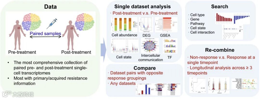 癌症耐药是临床治疗的主要障碍,约 90% 的癌症相关死亡与耐药直接相关。传统研究难以捕捉治疗前后肿瘤细胞及微环境的动态变化,而单细胞 RNA 测序技术虽能实现高分辨率分析,但海量数据的整合与复用面临巨大挑战。现有数据库要么覆盖范围有限,要么缺乏系统的治疗前后配对数据,无法满足机制研究需求。
