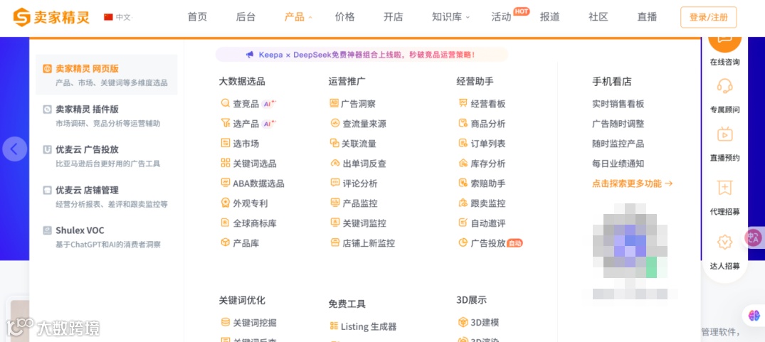 做亚马逊的伙伴可以使用卖家精灵,包含选品、关键词监控、广告流量查看等等功能。