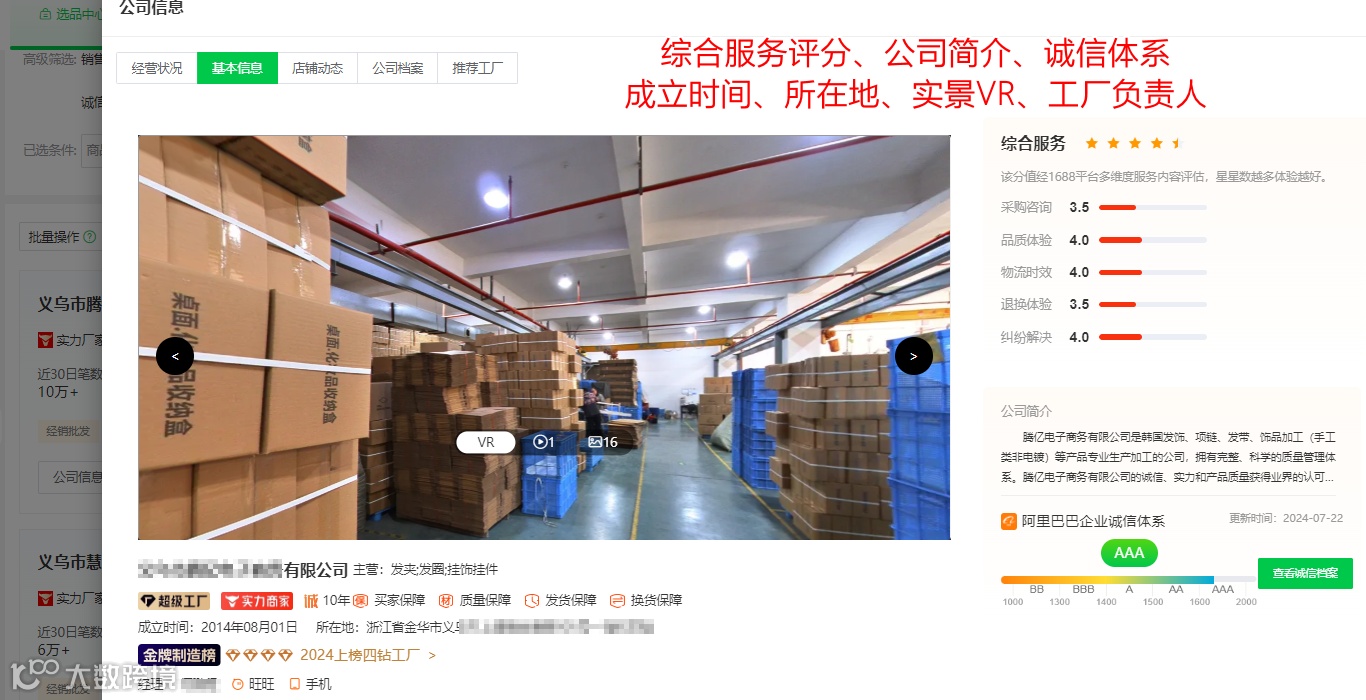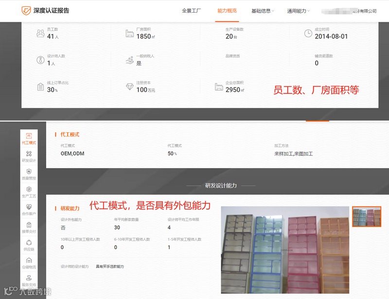 查看店铺的综合信息(包括经营状况、服务评分、店铺动态等)以及店铺商品历史销量,进一步判断供应商的综合实力。通过验厂报告查看厂家规模和设备实力。