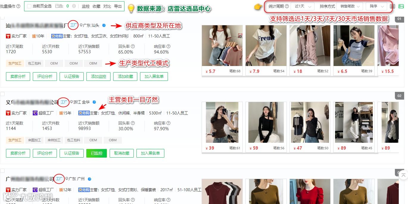 经过前面初步筛选出较为满意的供应商,我们也可以横向对比市场上其他的供应商,多家比对,可以直接去热销工厂榜或飙升工厂榜单查看,找到优秀厂家跟进定制化需求。有意向的供应商可以添加收藏、或者监控,这样方面我们下次直接找到该厂家,不要重头再做筛选。希望今天的分享对各位商友有所帮助,提供帮助。