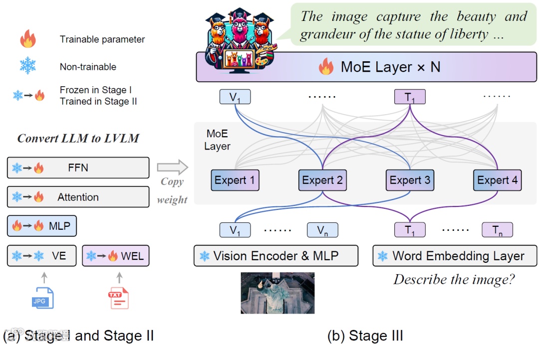 MoE在处理融合文本、图像、音频等多种数据类型的多模态任务中展现出巨大潜力。通过MoE,模型可以为不同模态或不同任务动态分配专家:一些专家可能专门处理文本信息,另一些专家处理视觉信息,还有一些专家则负责跨模态的对齐与融合 。