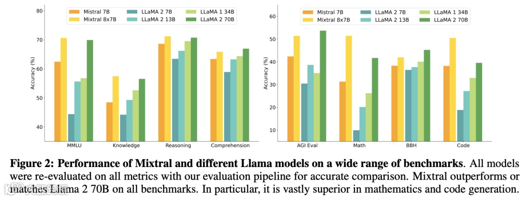 Mixtral 8x7B :由Mistral AI发布的开源模型,其以约13B的激活参数,在众多基准测试中击败了拥有70B参数的Llama 2 70B模型,成为开源社区的标杆。