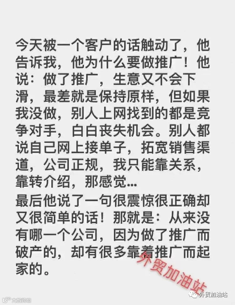 昨天又被一个客户的话触动了,他告诉我,为什么要做互联网?他说:做了互联网,生意又不会下滑,好歹我是在努力想做好公司。最多就是保持原样,但如果,我没做,别人上网找到的都是竞争对手,白白丧失机会。别人都说自己网上接单子,拓宽销售渠道,公司正规,我只能靠关系,靠介绍,那感觉……