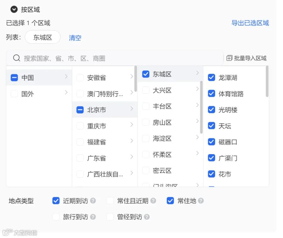 地理位置筛选:按照区域范围来做定向(如:省,市,县,区,任意位置覆盖)