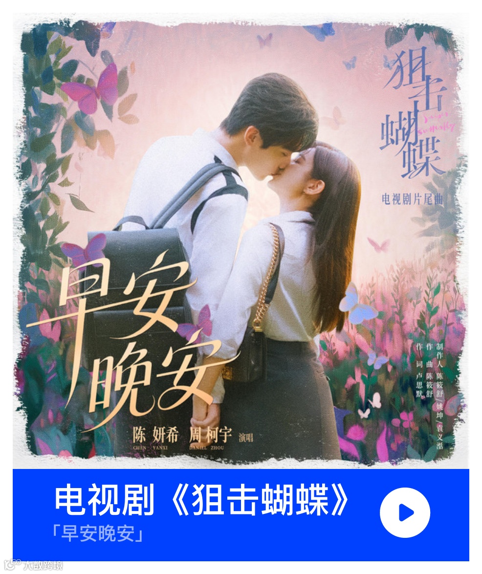 歌曲《早安晚安》是电视剧《狙击蝴蝶》的片尾曲,由陈妍希、周柯宇演唱,陈筱舒作曲,卢思默作词,陈筱舒、姚坤、袁义湉担任制作人。该剧由腾讯视频、嘉行传媒联合出品,嘉行传媒独家承制,黄天仁、俞波执导,高琛、方芳担任总制片人,徐一天编剧,陈妍希、周柯宇领衔主演。