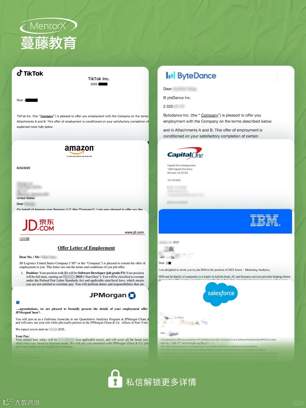 截止目前,蔓藤教育已成功助力三万多名留学生实现海外和海归就业,进入苹果、谷歌、Facebook、亚马逊、微软、Intel、Nvidia、Broadcom、尼尔森、摩根斯坦利、高盛、麦肯锡、汇丰、KPMG、德勤、EY、阿里、腾讯、Tiktok、华为、中芯国际等世界知名企业,为他们的职业生涯打下良好开端。