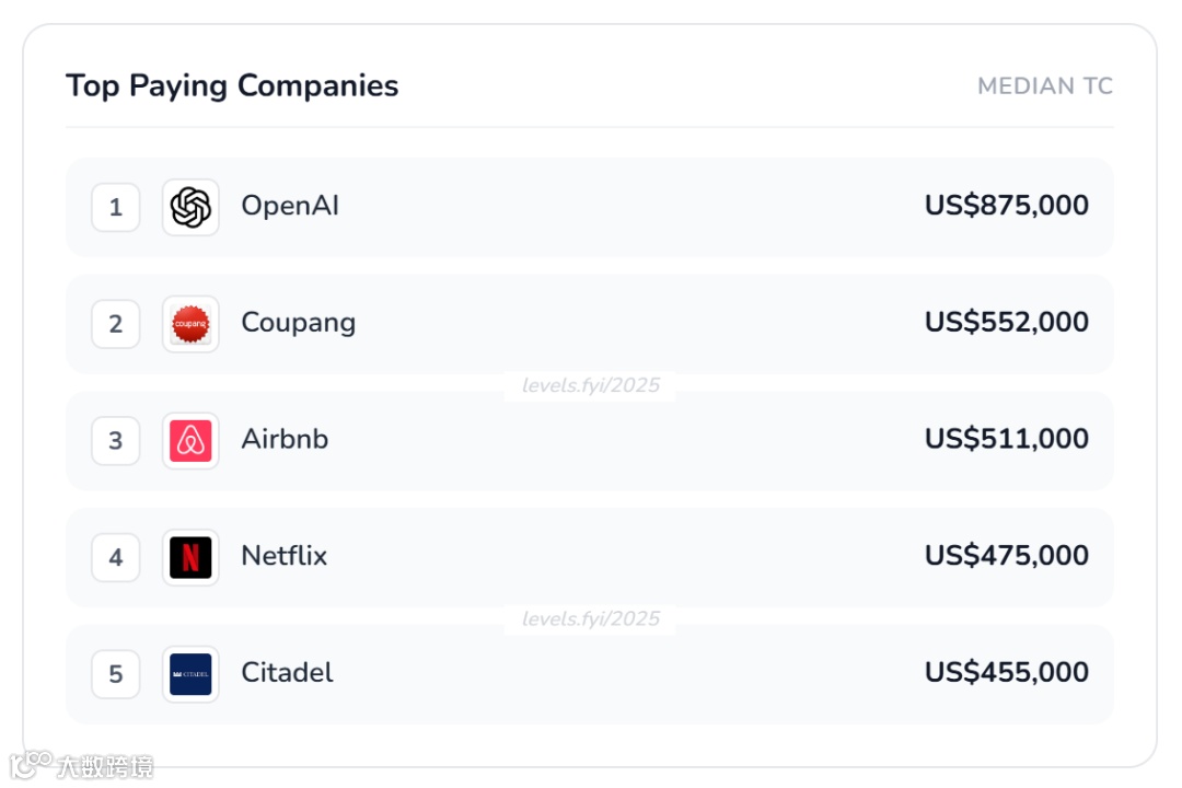 OpenAI以50.5万美元的薪资中位数跃居榜首,超越了长期领先的金融公司Citadel,这标志着AI公司正式站上薪酬金字塔的顶端。