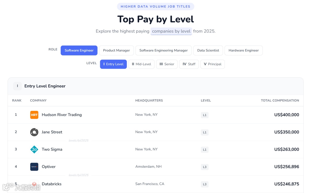 👉Jane Street、Two Sigma、Optiver紧随其后,起薪在25.5万至35万美元之间