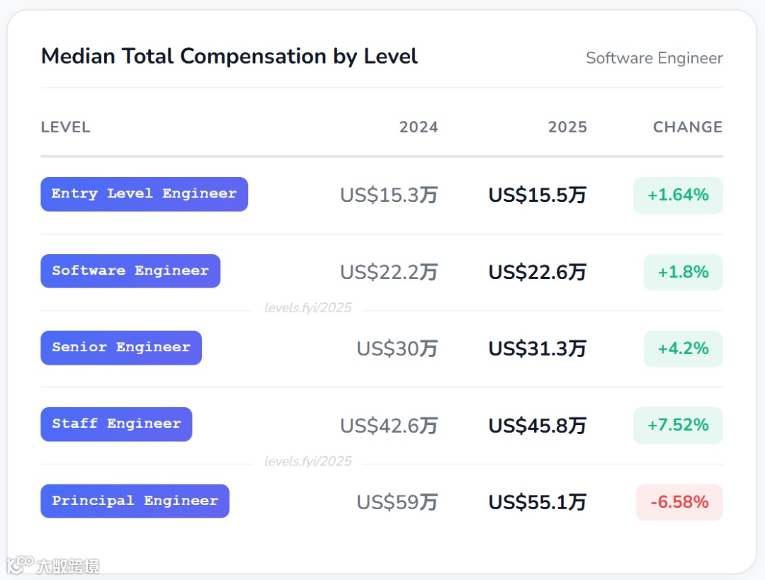 从资历看,薪资增长呈现分化。过去一年,Staff级别工程师薪资涨幅最高,达7.52%,中级(Mid)和高级(Senior)分别增长1.8%和4.2%。