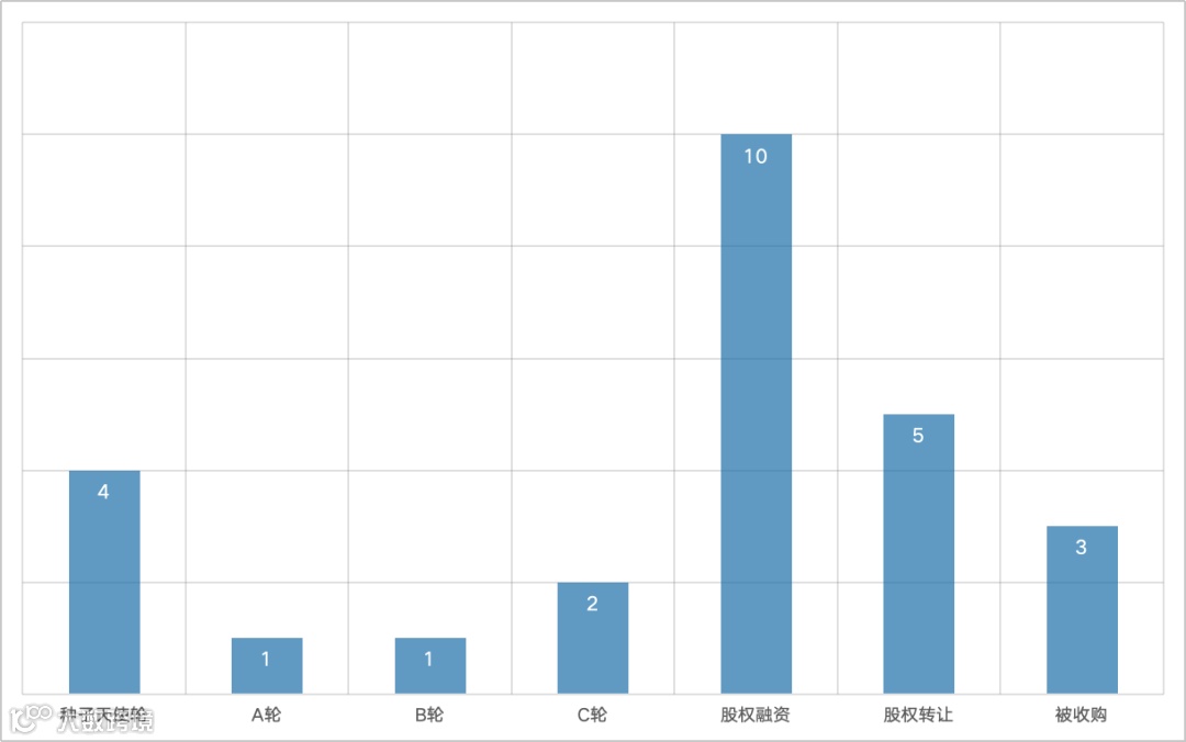 从融资轮次来看,股权融资(未明确轮次)占比最高,达37%,共10起;股权转让5起,占比18.5%;种子天使轮4起,占比14.8%;C轮2起;B轮和A轮各1起。早期融资(种子/天使/A轮)占比18.5%,成长期融资(B轮及以后)占比11.1%,资本对各个阶段项目均持续关注。