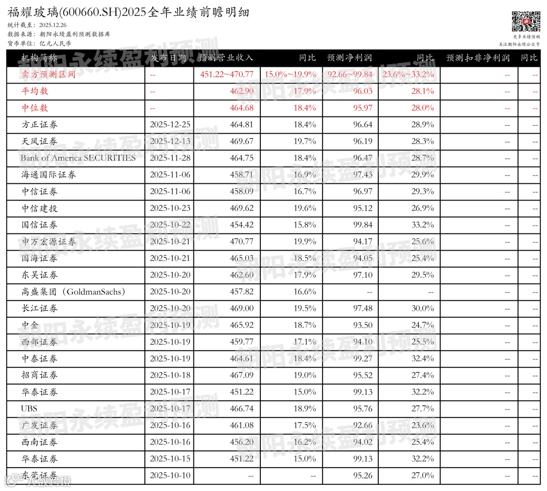 截至2025年12月26日,根据朝阳永续季度业绩前瞻数据: