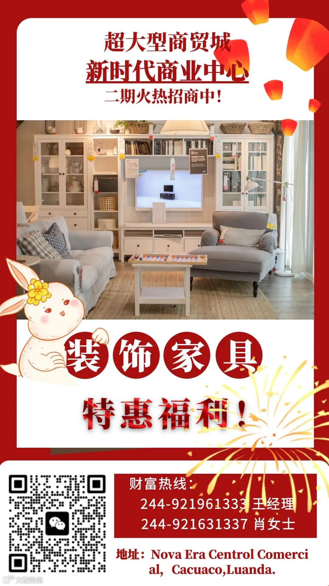 项目一期388间商铺已全部售罄。目前二期招商正式启动,重点引进装饰家具、五金建材、汽修汽配三大产业商家。随着安哥拉经济持续复苏,该项目有望成为区域经济增长新引擎,诚邀广大在安华商共谋发展。