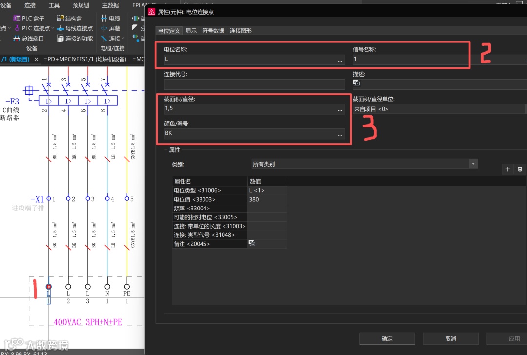 在进线电源处(最下方),分别定义电位L、N、PE,对于不同相线用信号名称区分,分别定义1,2,3。
