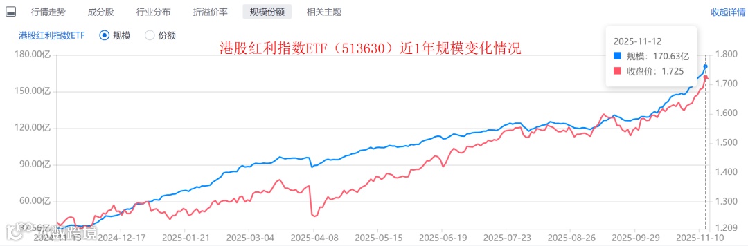 产品规模上,港股红利指数ETF(513630)市场上最大的港股红利ETF,截至11月12日,ETF规模突破170亿元,流动性佳,今年以来日均成交额3亿元。