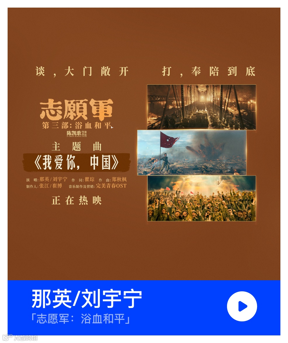 歌曲《我爱你,中国》由瞿琮作词、郑秋枫作曲,是陈凯歌执导电影《志愿军:浴血和平》的主题曲。在熟悉的旋律中,那英和刘宇宁的演唱表达了“最可爱的人”用生命守护的山河温度和中华儿女对祖国母亲最炽热的爱。这首歌不仅回荡着先烈的嘱托与期望,更饱含了对英雄精神的仰望与传承,旨在激励每一个中华儿女铭记历史、珍惜和平,激发强烈的家国情怀。