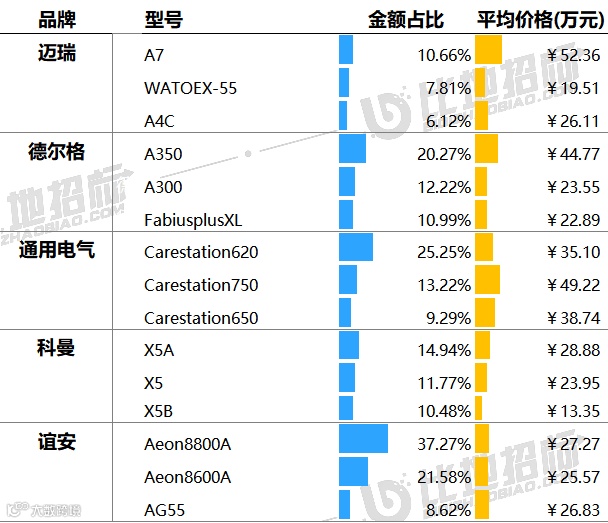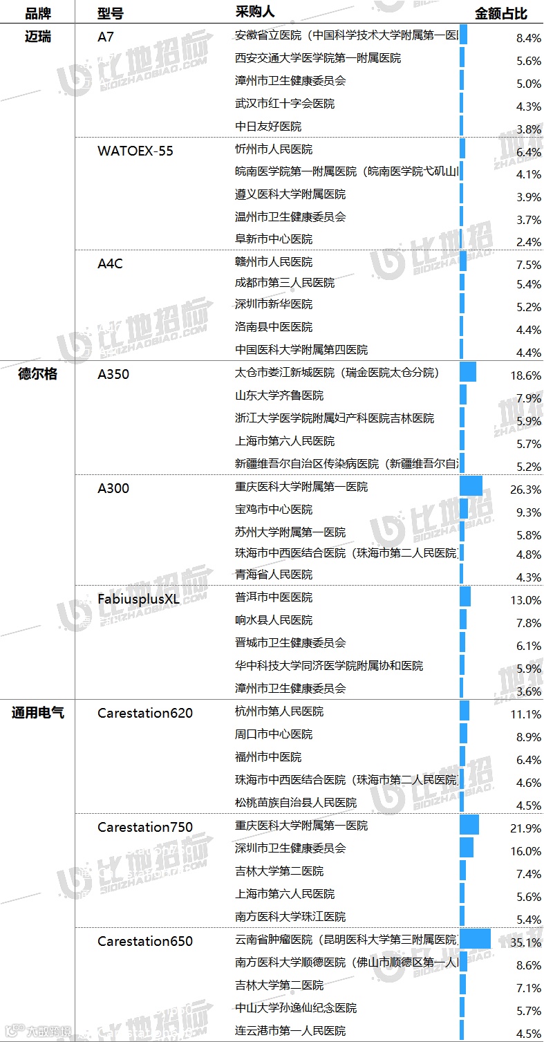 主要采购单位及对应中标品牌包括:太仓市娄江新城医院(瑞金医院太仓分院)(德尔格),杭州市第人民医院(通用电气),安徽省立医院(中国科学技术大学附属第一医院)(迈瑞)等。