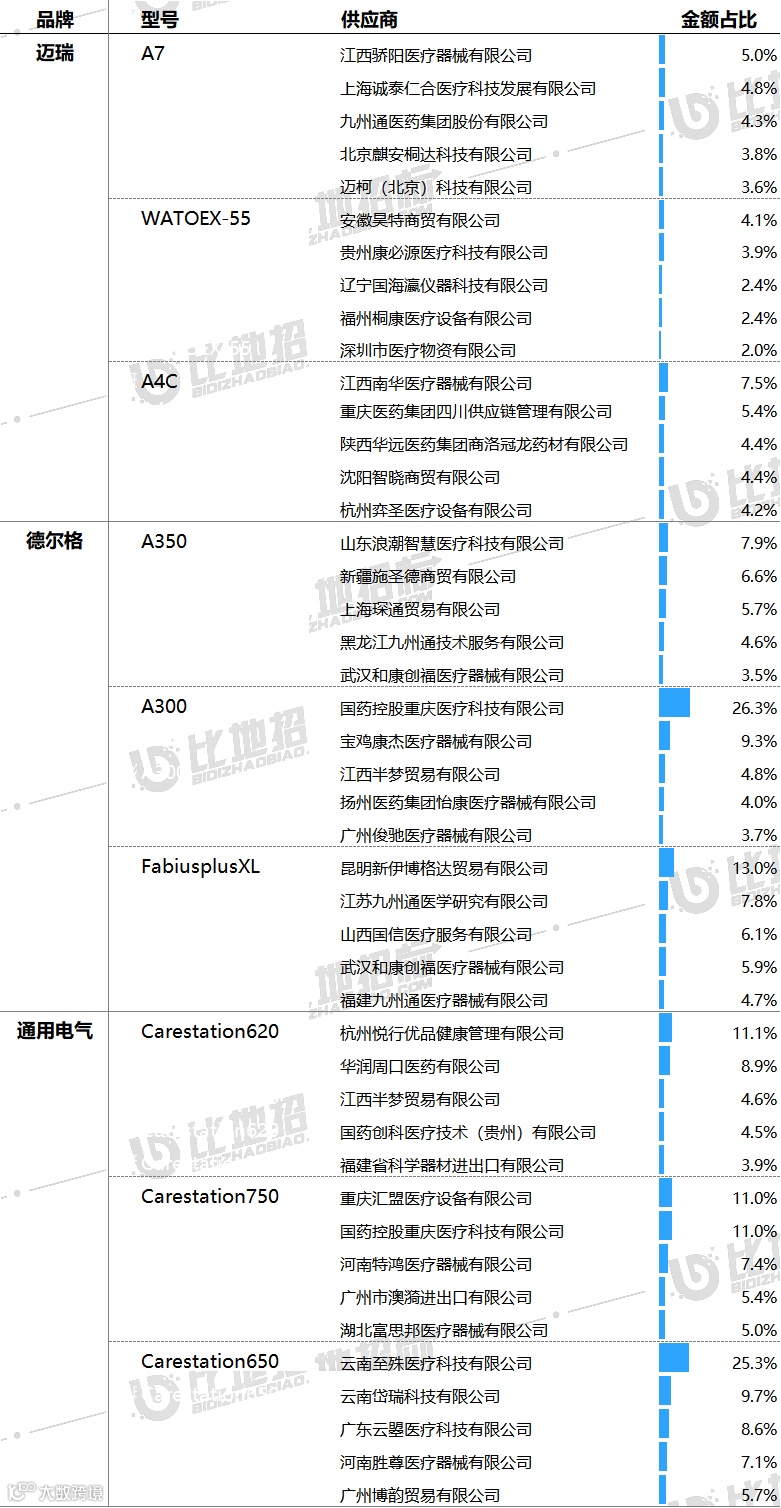 主要供应商及对应中标品牌包括:山东浪潮智慧医疗科技有限公司(德尔格),杭州悦行优品健康管理有限公司(通用电气),江西骄阳医疗器械有限公司(迈瑞)等。