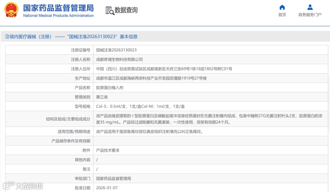 近日,国家药品监督管理局信息显示,成都奇璞生物科技有限公司自主研发的“SPF级胶原蛋白植入剂”已获三类医疗器械注册证(注册证编号:国械注准20263130023),正式获批上市。据悉,该产品是填补国内SPF级猪源生物材料空白的一大突破。这一突出成果背后,有奇璞生物、中科奥格等成都科技力量提供支撑。