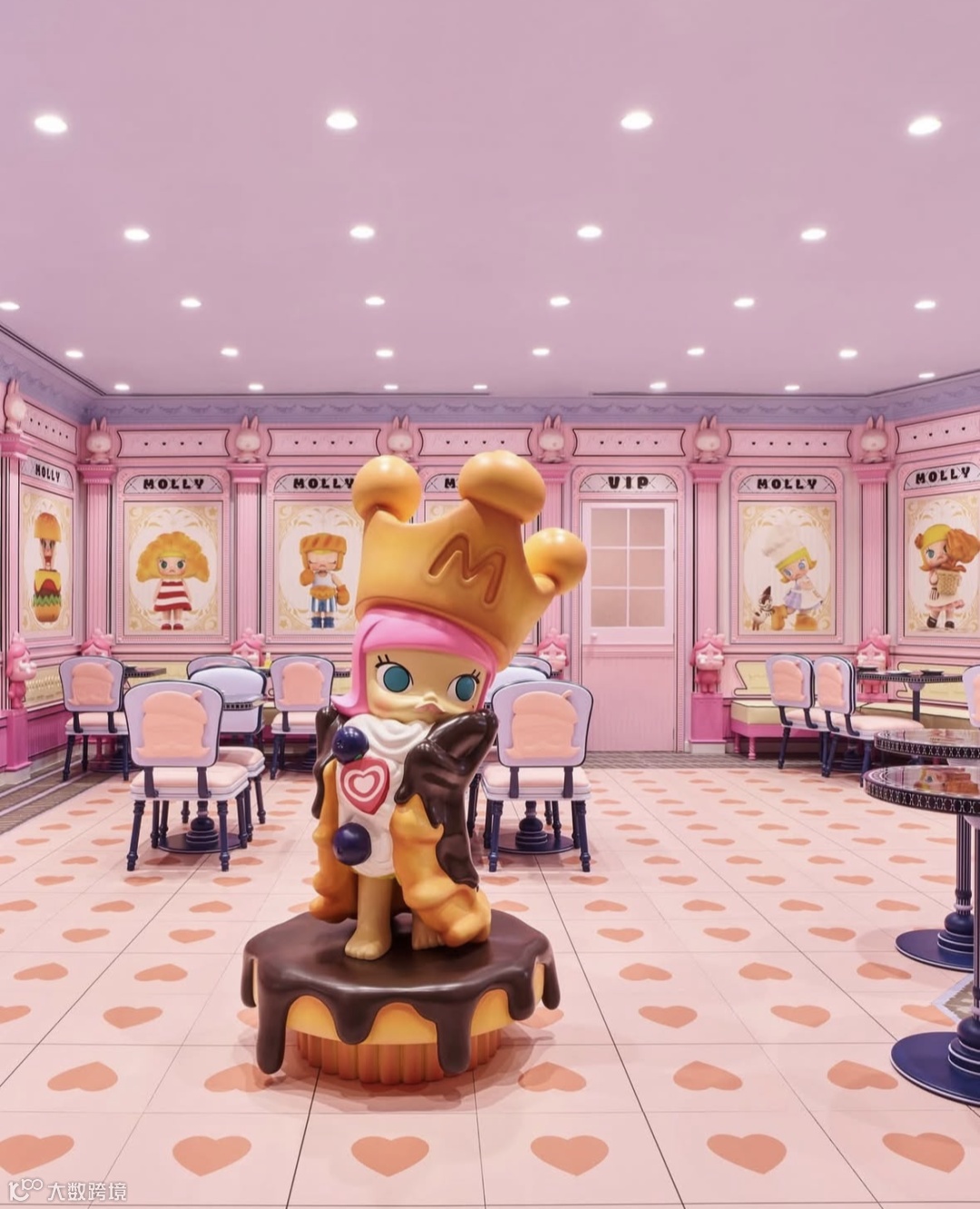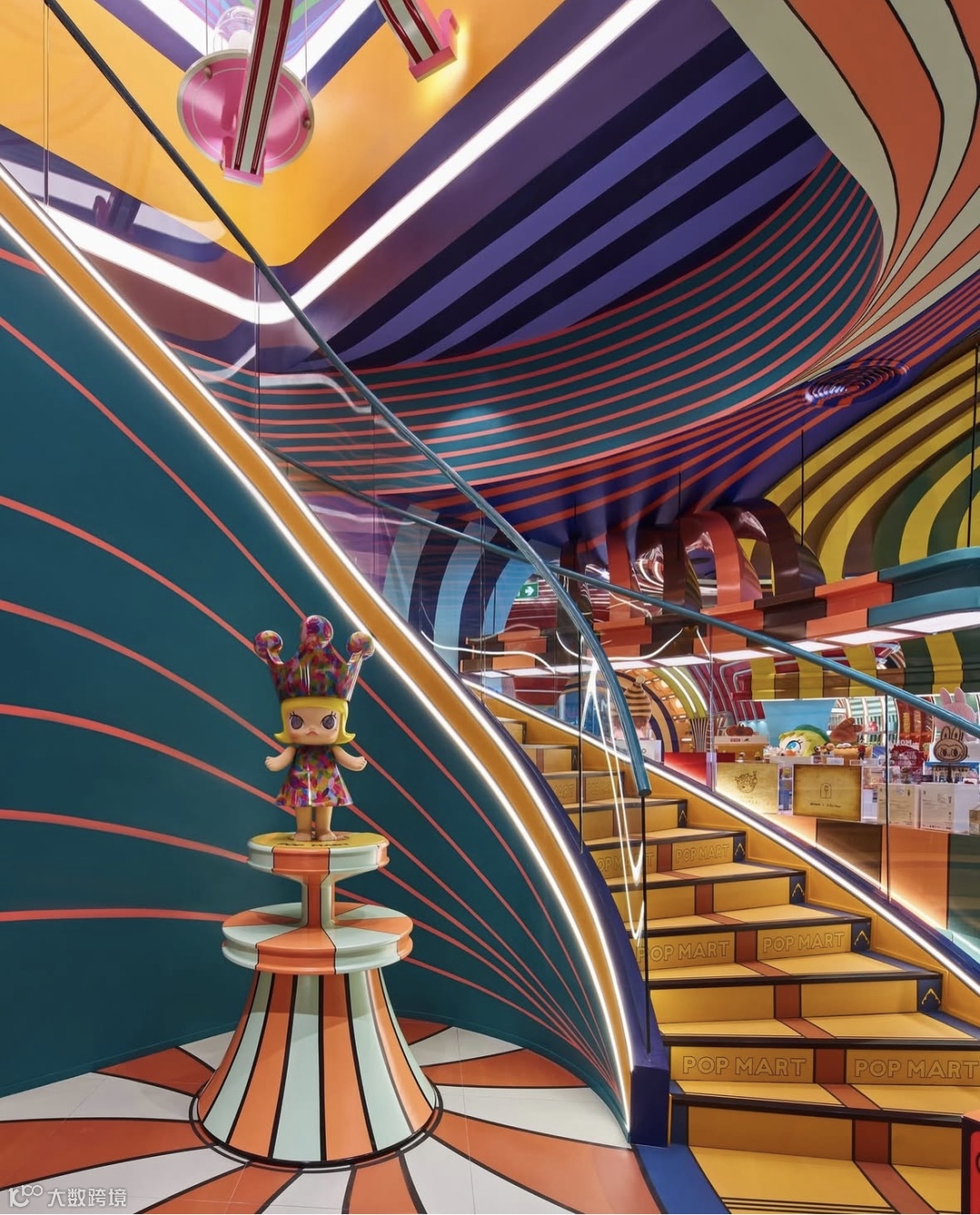 整个旗舰店分为上下两层,每层都有独特的功能定位和设计巧思。一层的 MEGA区最抢眼的是MOLLY和THE MONSTERS的大型雕塑,一进门就能看到,自然而然成了大家拍照打卡的热门地点。旁边还专门划分了潮玩专区和POP BEAN互动区,让人忍不住想一步步逛下去探索更多惊喜。店内的路线设计成环形闭环,旋转楼梯搭配艺术灯具把两层楼自然连接起来,走在里面既能感受到空间的流动感,又能保持探索的新鲜感。