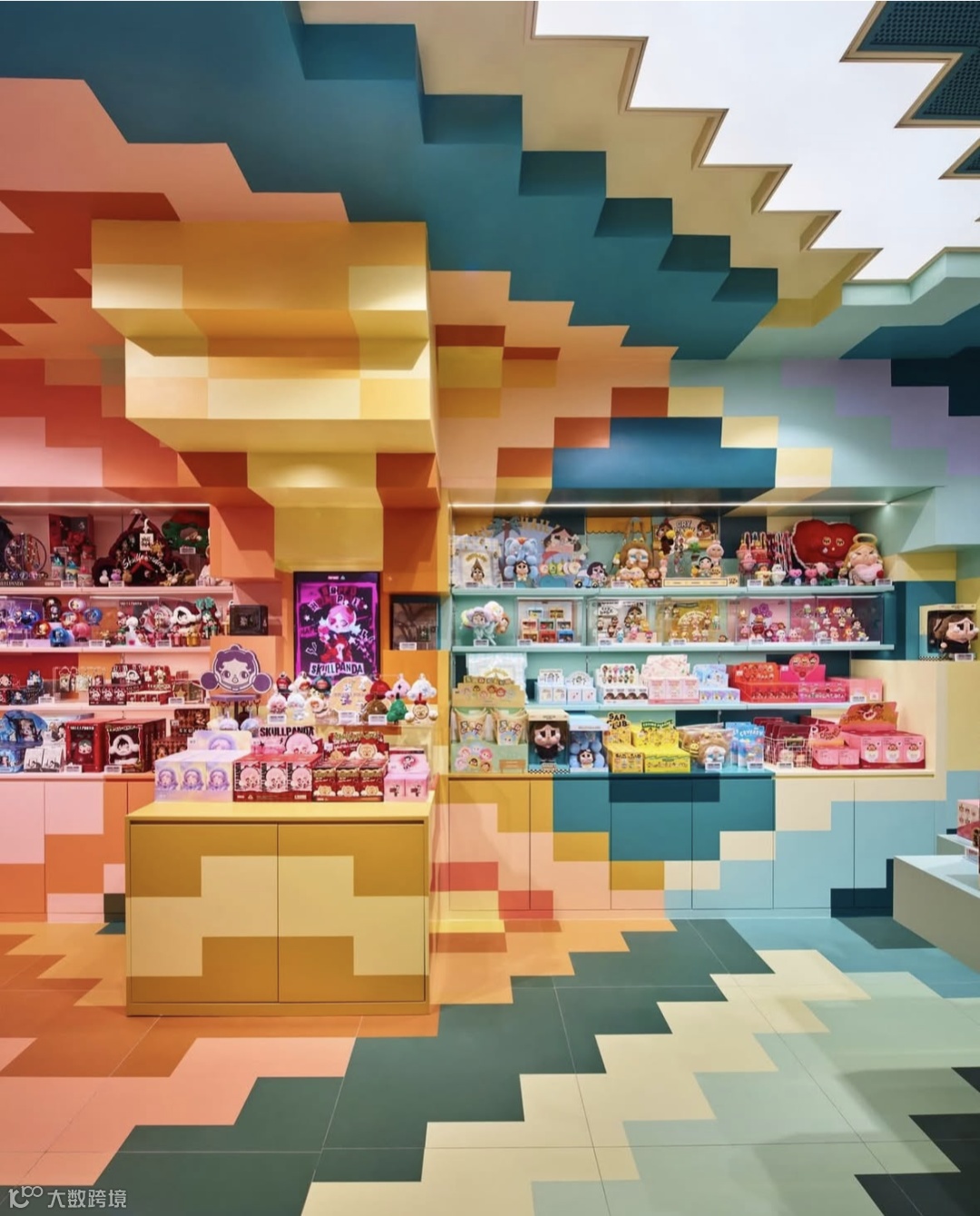 到了二层,设计灵感来自泰国传统建筑,整体结构像魔方一样巧妙,搭配鲜亮活泼的颜色,把这里变成了潮玩爱好者的专属游乐场。这样的空间设计让顾客能顺着"认识产品-产生兴趣-参与体验-完成消费"的节奏自然流动,不知不觉就走完了整个消费旅程。