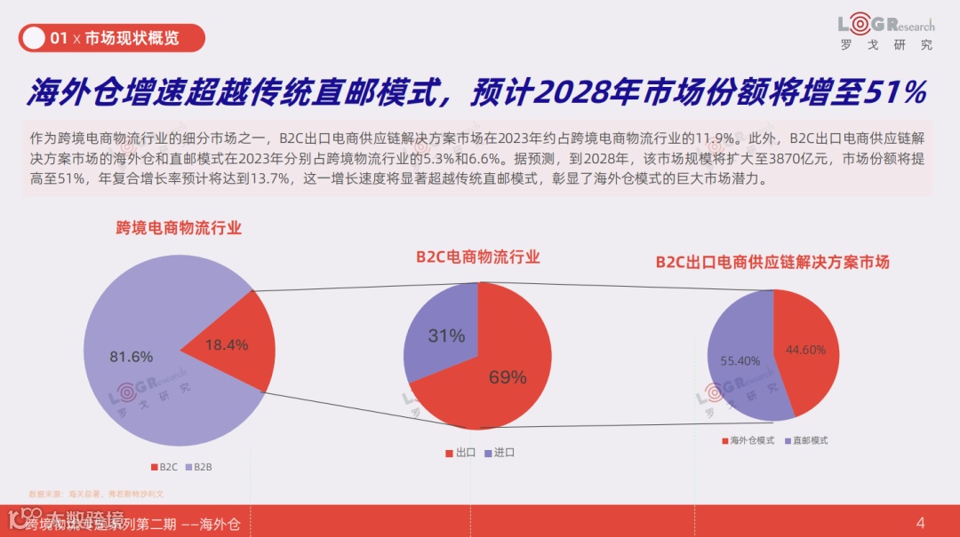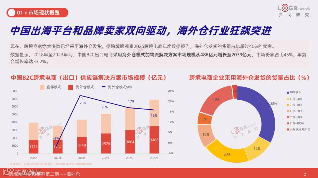 2018-2023 年,中国 B2C 出口电商海外仓模式市场规模从 486 亿元增至 2039 亿元,年复合增长率达 33.2%,预计 2028 年市场份额将提升至 51%。