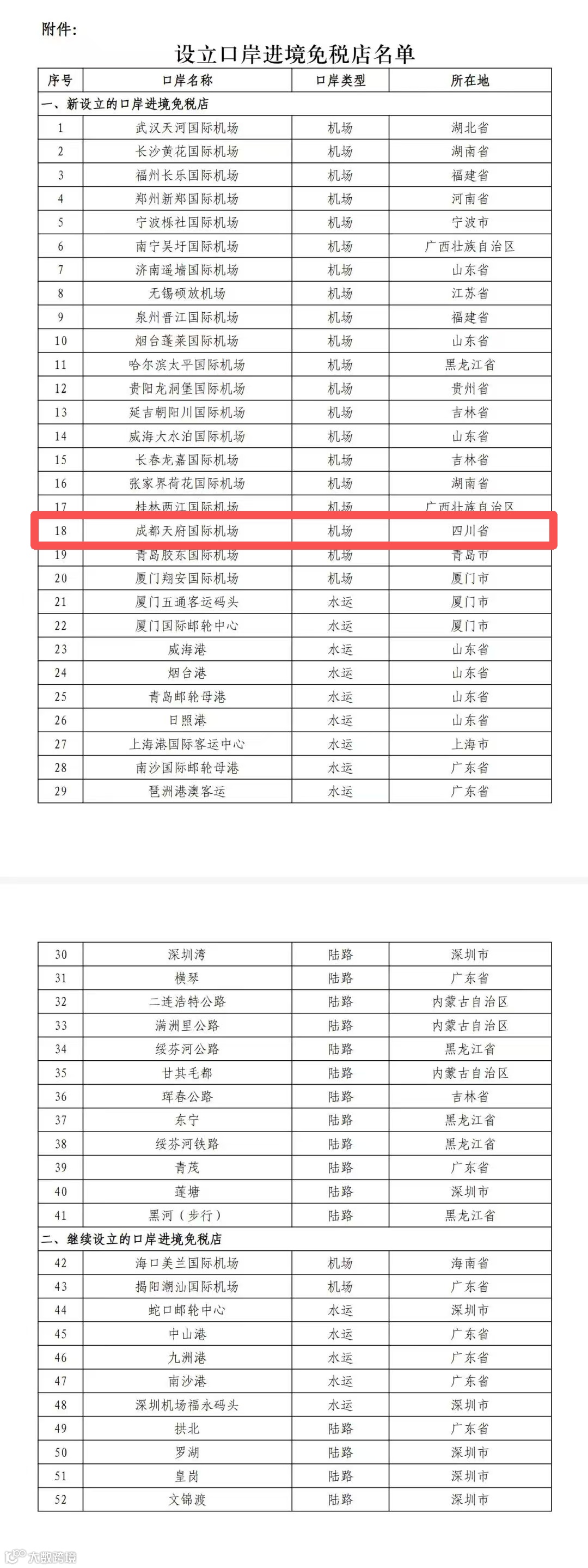包括武汉天河国际机场、成都天府国际机场等41个口岸(序号1—41)。其中,横琴口岸进境免税店设立后,允许自澳门进境居民旅客在该口岸购买不超过15000元的免税商品。