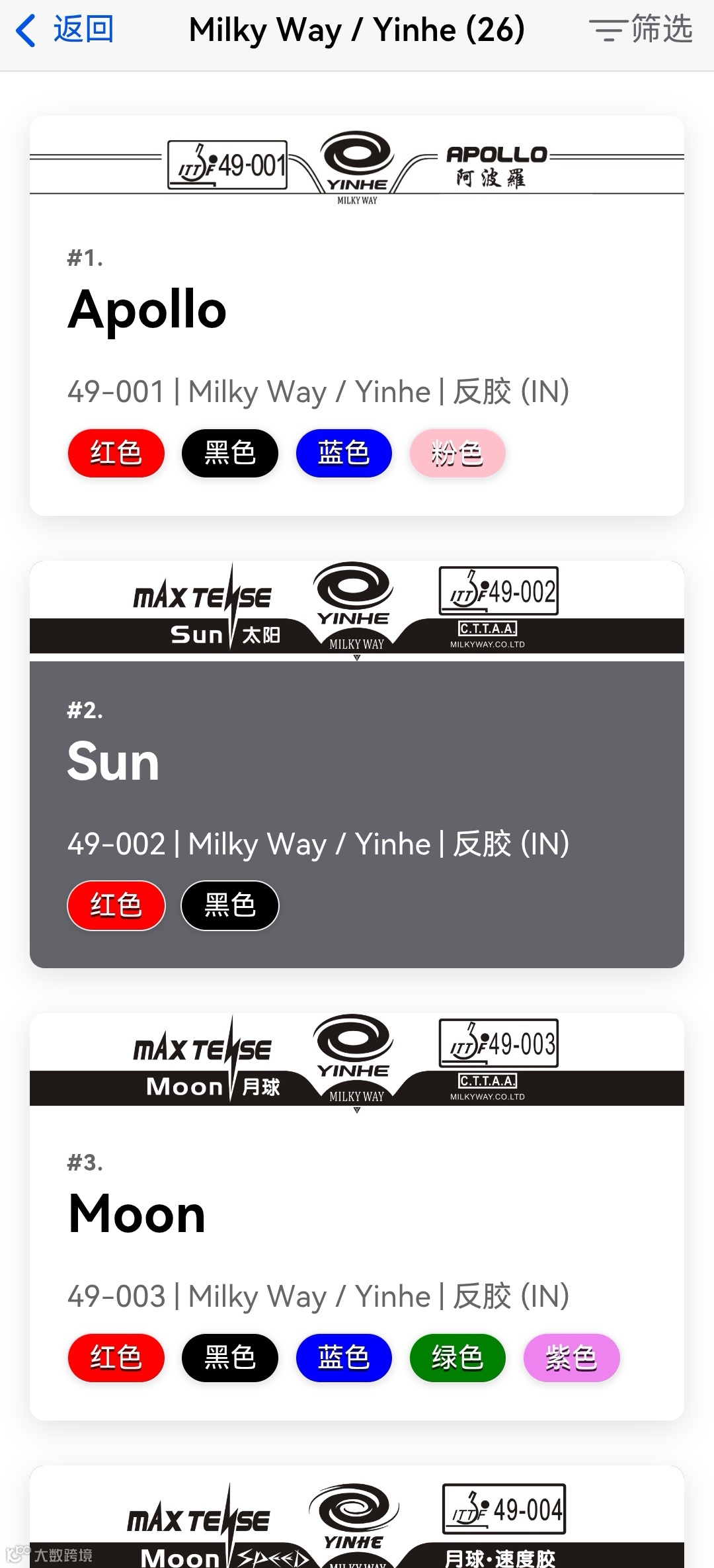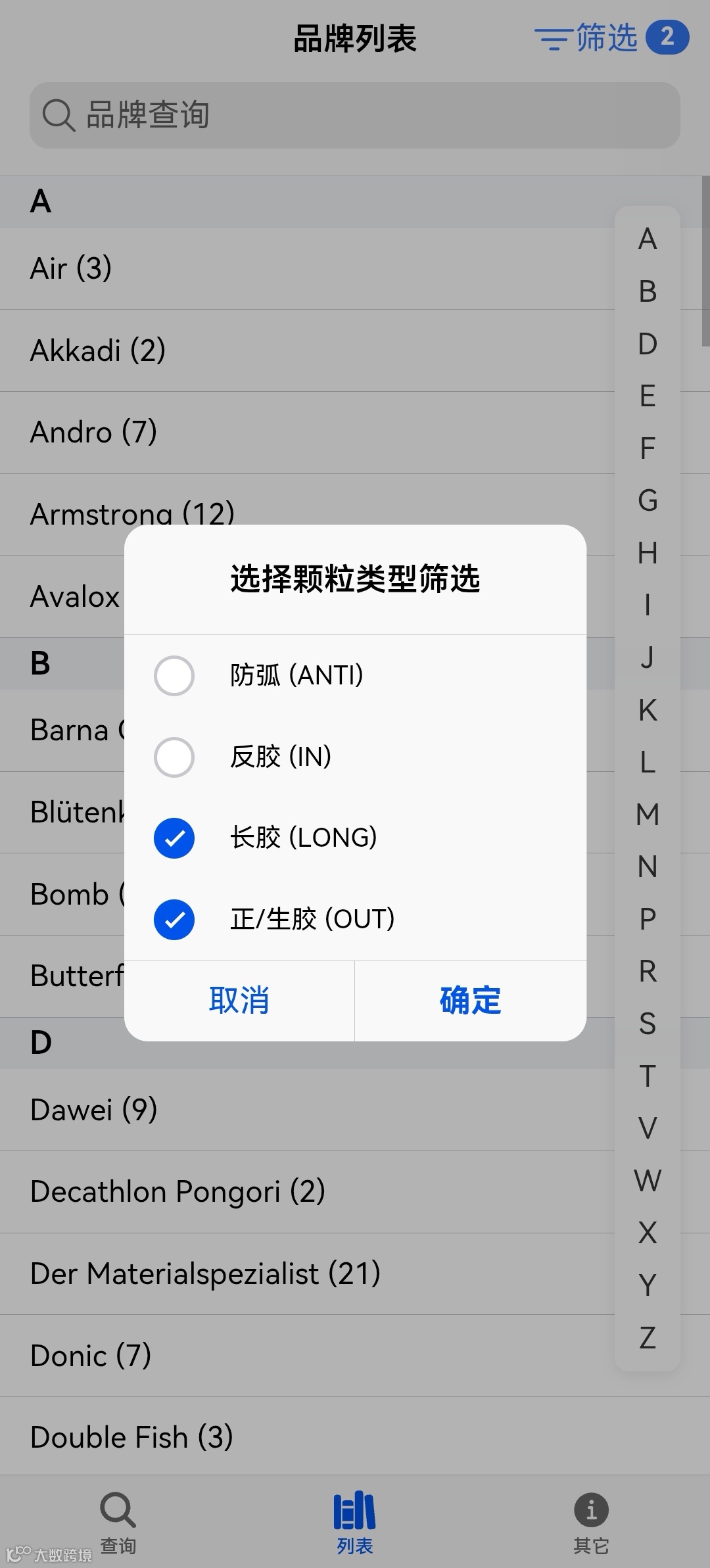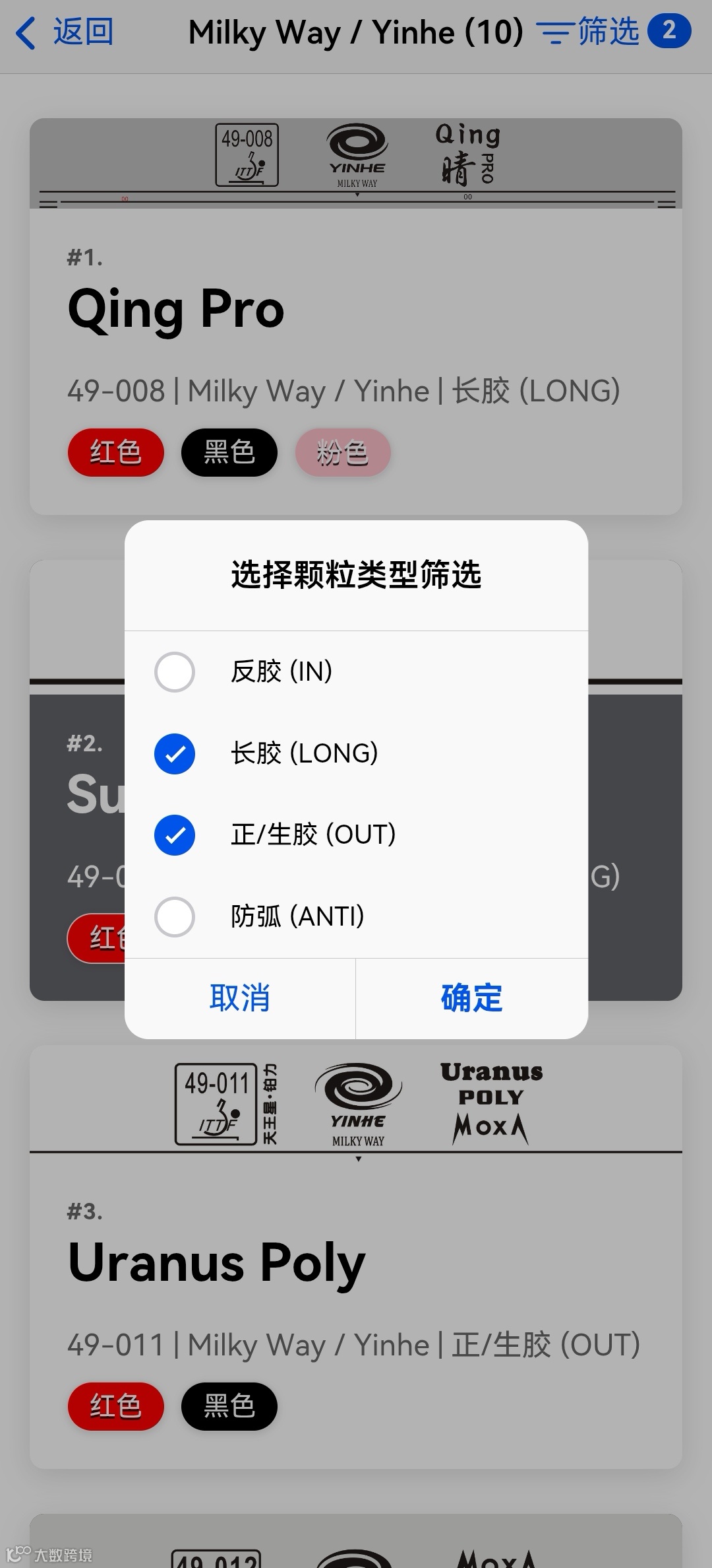 - 支持按胶皮类型筛选(反胶/正胶/长胶/防弧)