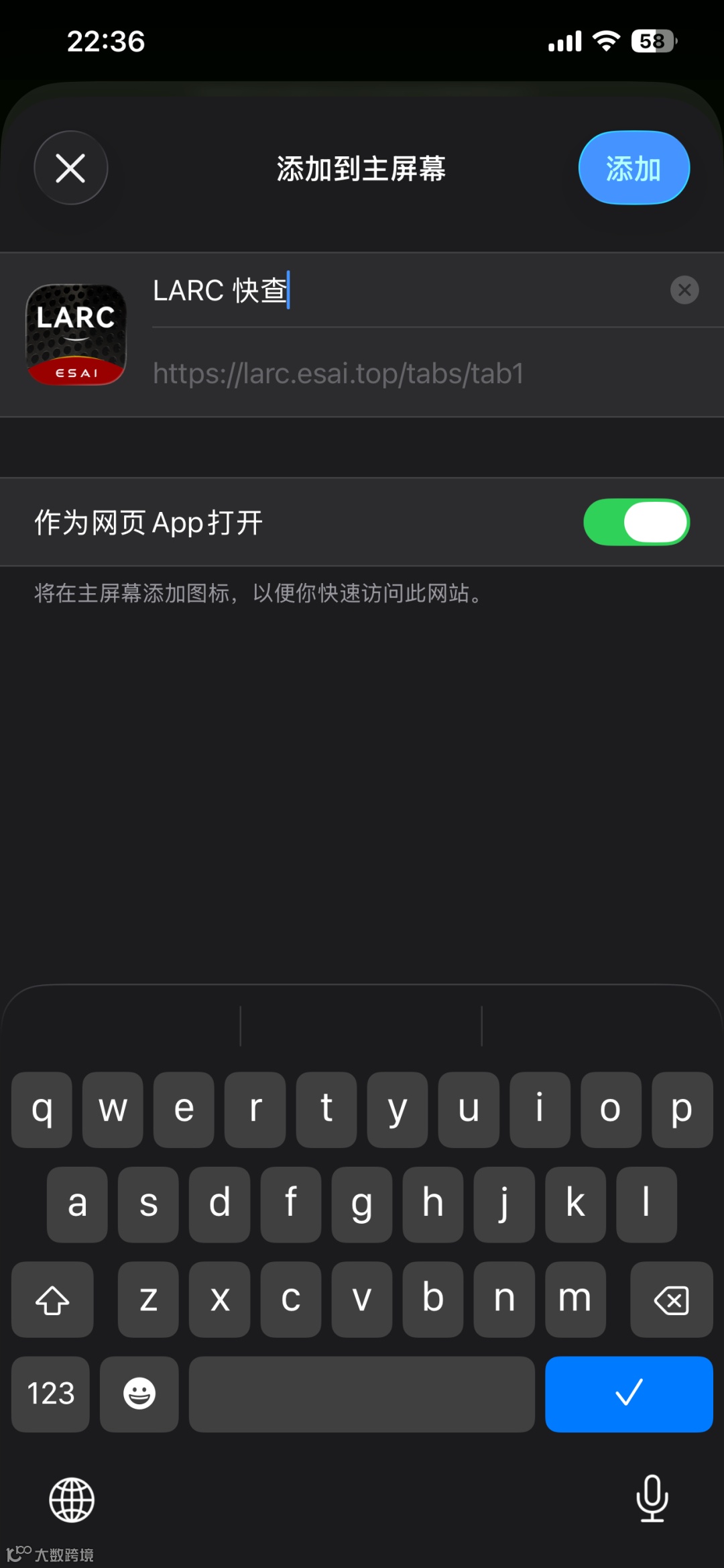- 输入名称(默认为“LARC快查”),点击“添加”